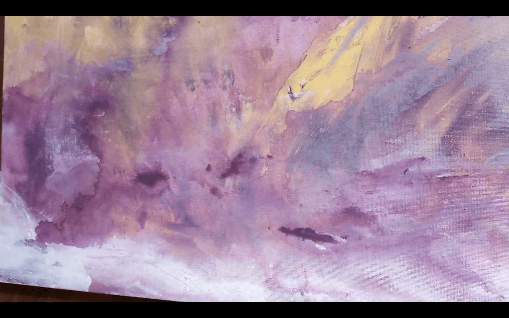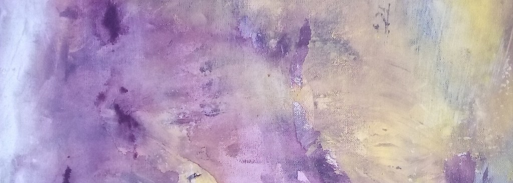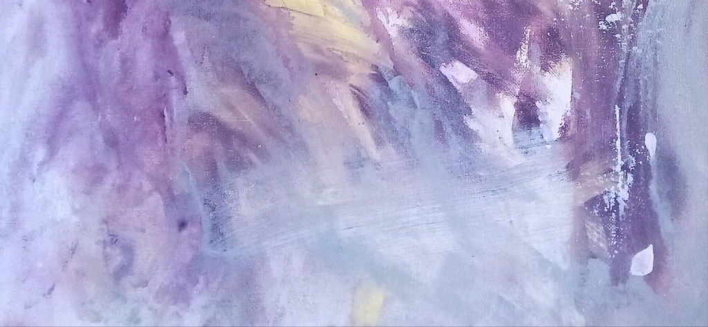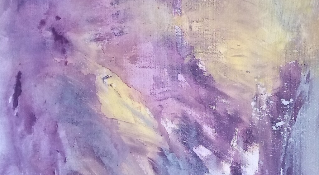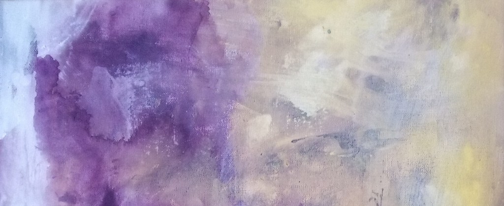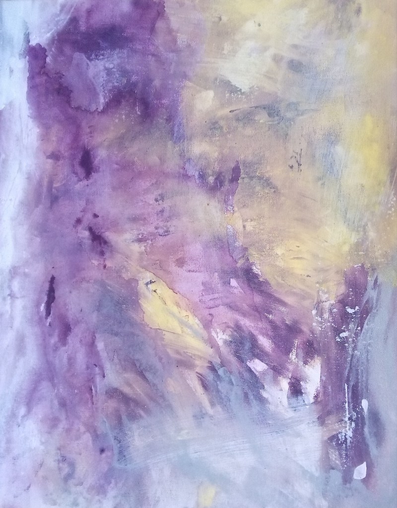 This painting was done after a large dry spell for most of the year. This was mostly a finger painting. I feel my emotions more and can paint even better when I use my fingers without trying too hard. Painting is a delicate process. What emotions does this evoke in you? I love purple and this is a color I often reach for. The yellow adds a bit of color and the gray fits well.